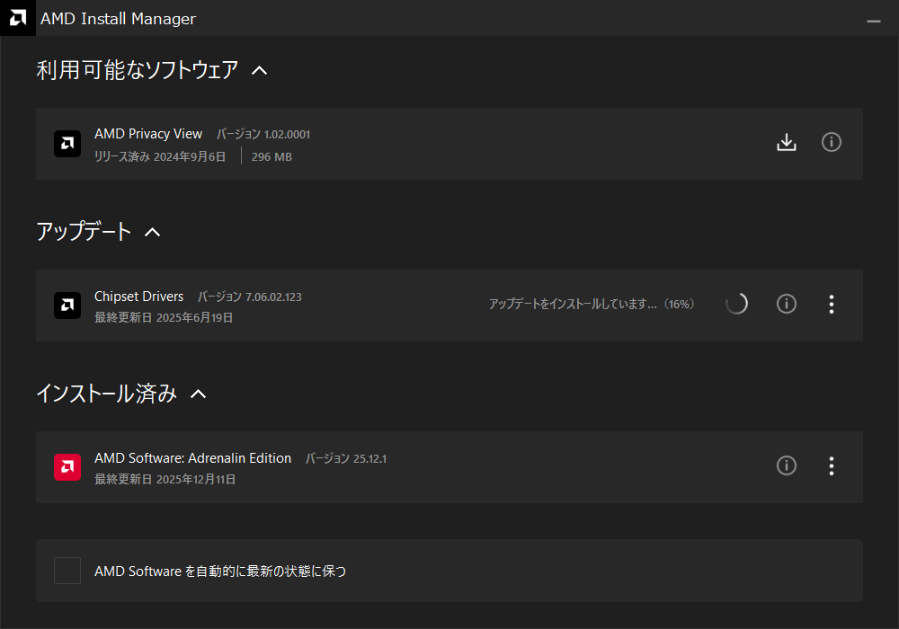 「ダウンロードの管理」からAMD Install Managerを開くと更新状況が確認できます。チップセットドライバーのインストール完了後は再起動を求められるので再起動しておいてください。