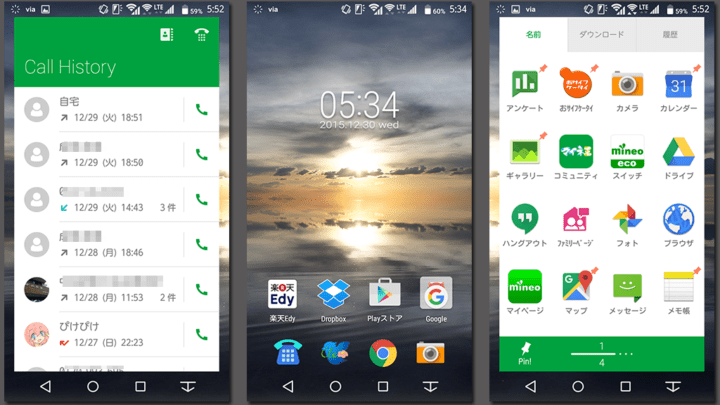 左側のページが発着信履歴で、右側のページがアプリケーションドロワーとなっています。ドロワー画面左下のPin!ボタンを押すと、あらかじめピンを立てておいたアプリだけをドロワーに表示することができます。履歴から電話を掛けることが多い方には便利な機能ですね。