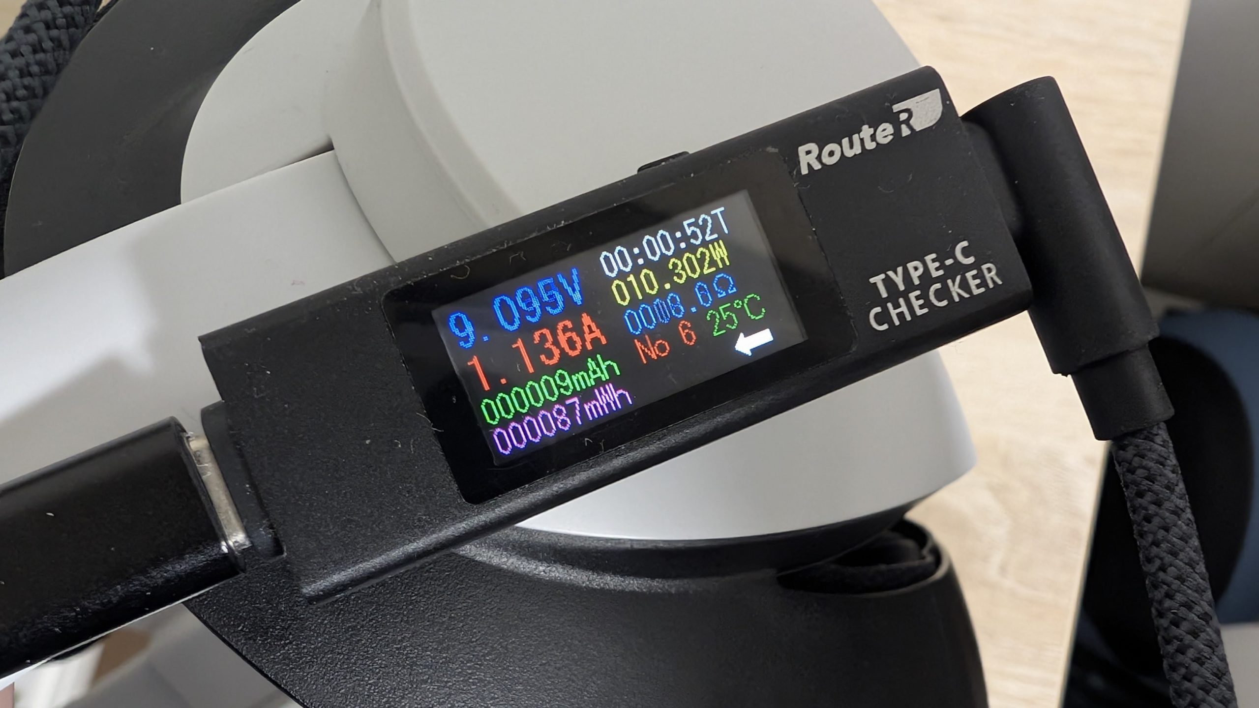 変換ロスを考慮せず単純計算すると、約10WでP5000バッテリーへ送られた電力は約4Wだけバッテリーの充電に使用して、約6WでVRヘッドセットへの給電を行う感じになるようです。充電インジケーターが点滅しますが、4W程度の低速充電なのでインジケーターが増えるまでかなりの時間がかかりました。