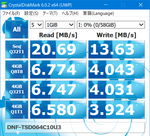(後日別のカードリーダーで同条件の測定をしたらシーケンシャルアクセス40MB/s出ました)