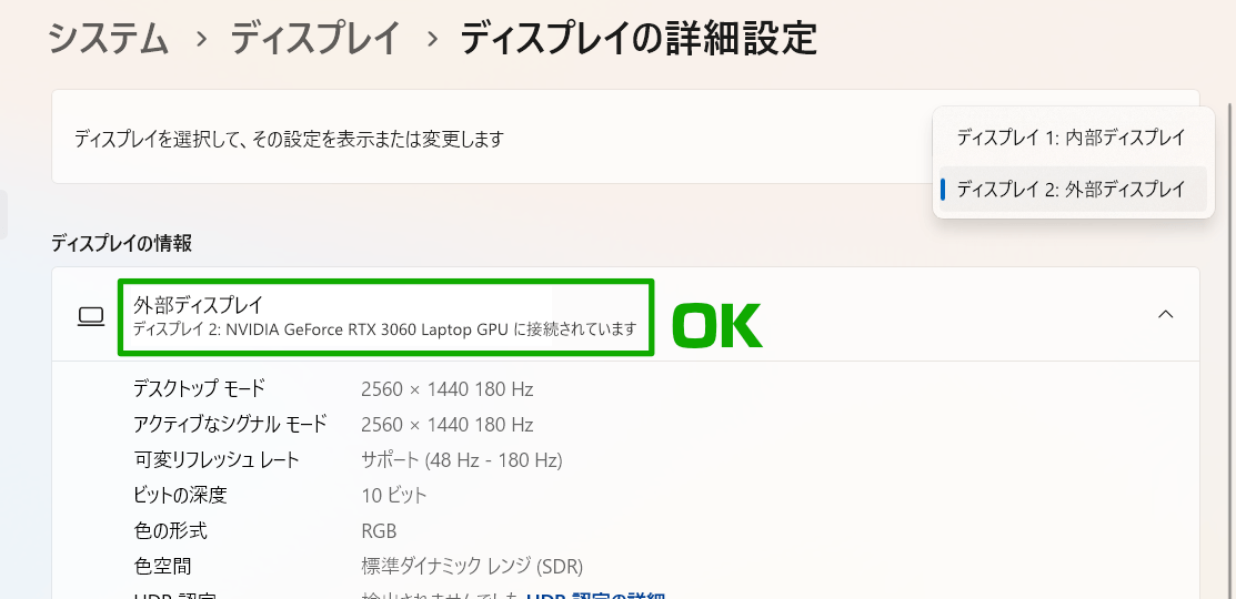 外部ディスプレイがNVIDIA GeForceに接続されているなら、ひとまずOKです。