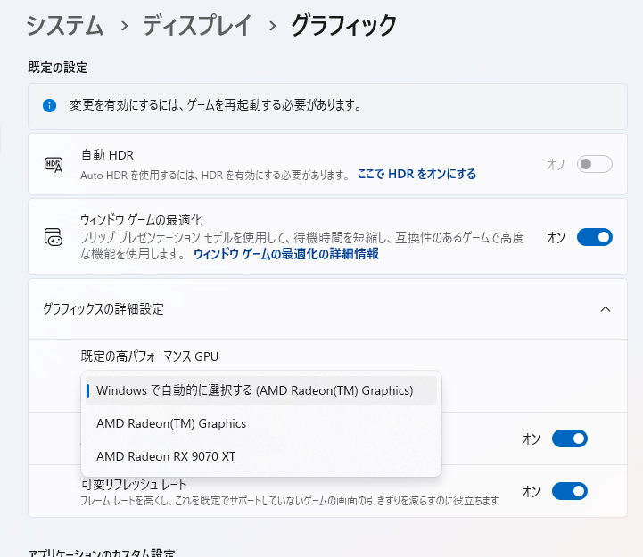 「システム>ディスプレイ>グラフィック>グラフィックスの詳細設定>規定の高パフォーマンス GPU」がIntel Iris Xe GraphicsやAMD Radeon Graphicsになっている場合があるので、メインディスプレイを切り替えても既定のGPUが変わらないようであれば変更しておいてください。