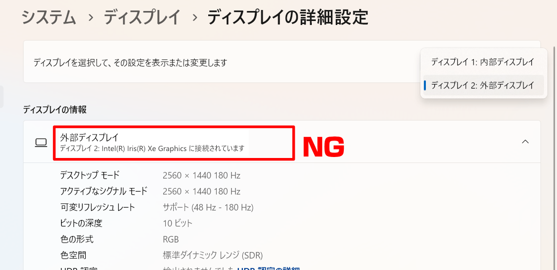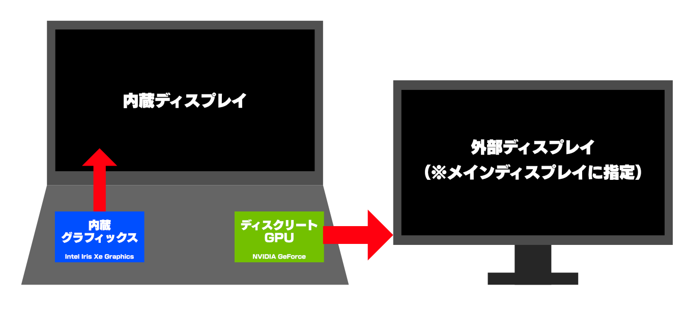 外部ディスプレイがIntel Iris Xe Graphicsなどに接続されている場合はNGです。他のポートに接続してNVIDIA GeForceと接続される場所を探してください。
