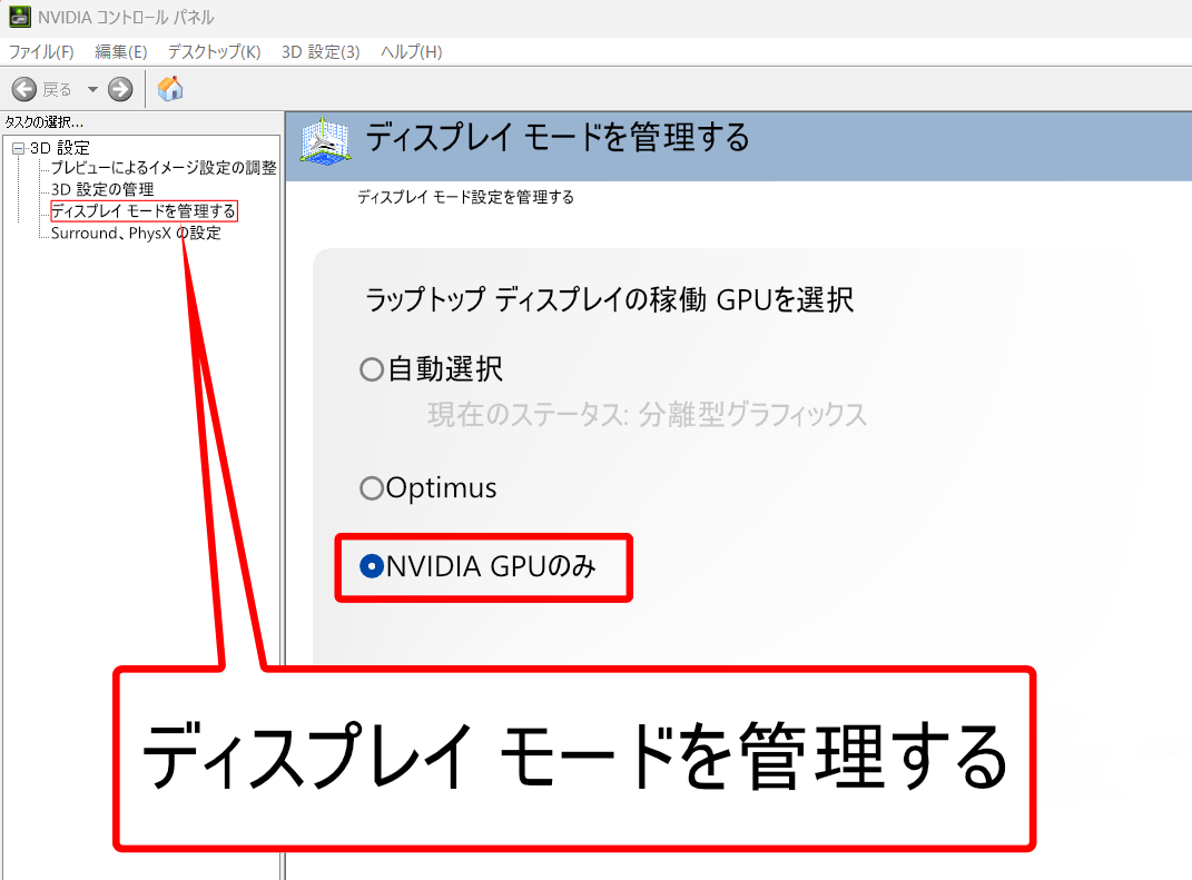 「ディスプレイ モードを管理する」から「NVIDIA GPUのみ」に切り替えてください。