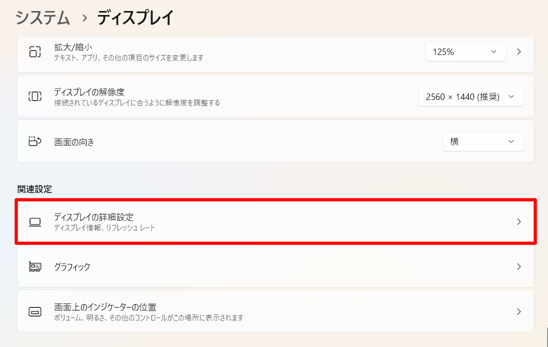「システム>ディスプレイ>ディスプレイの詳細設定」を開いてください。