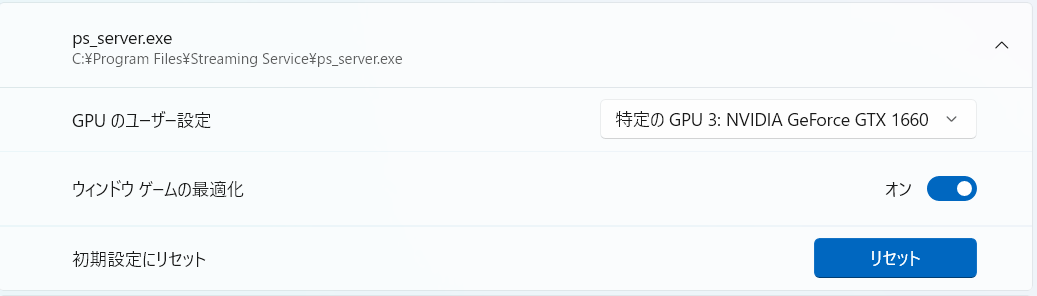 Windowsのグラフィック設定に「アプリケーションのカスタム設定」はありますが、PICO Connectのストリーミングサービス部分(ps_server.exe)はここで指定したGPUを使用してくれるわけではないようです。