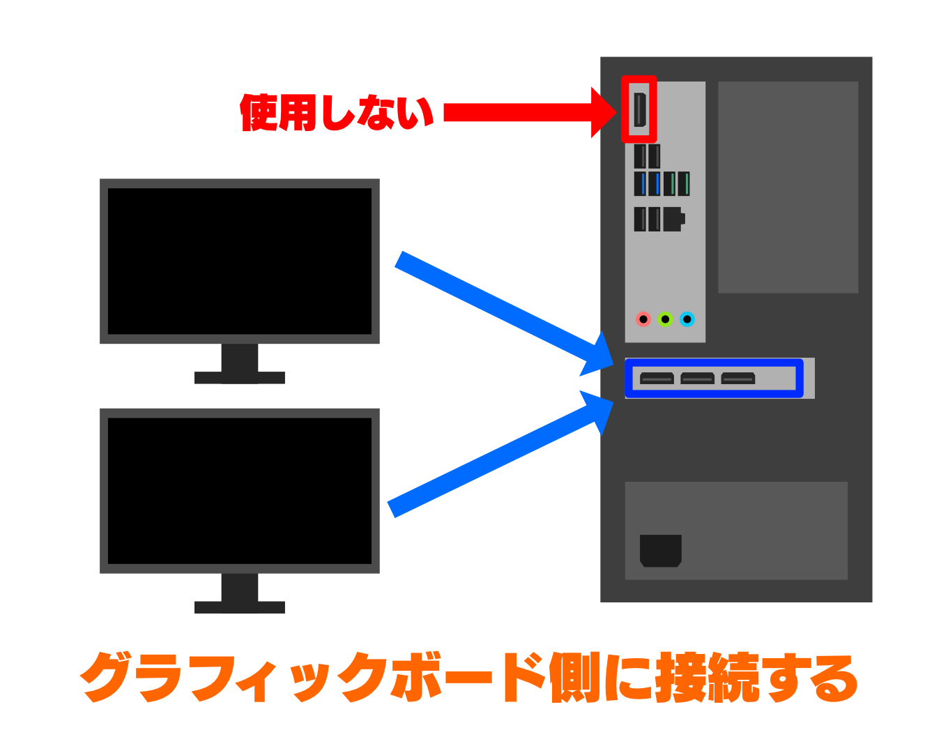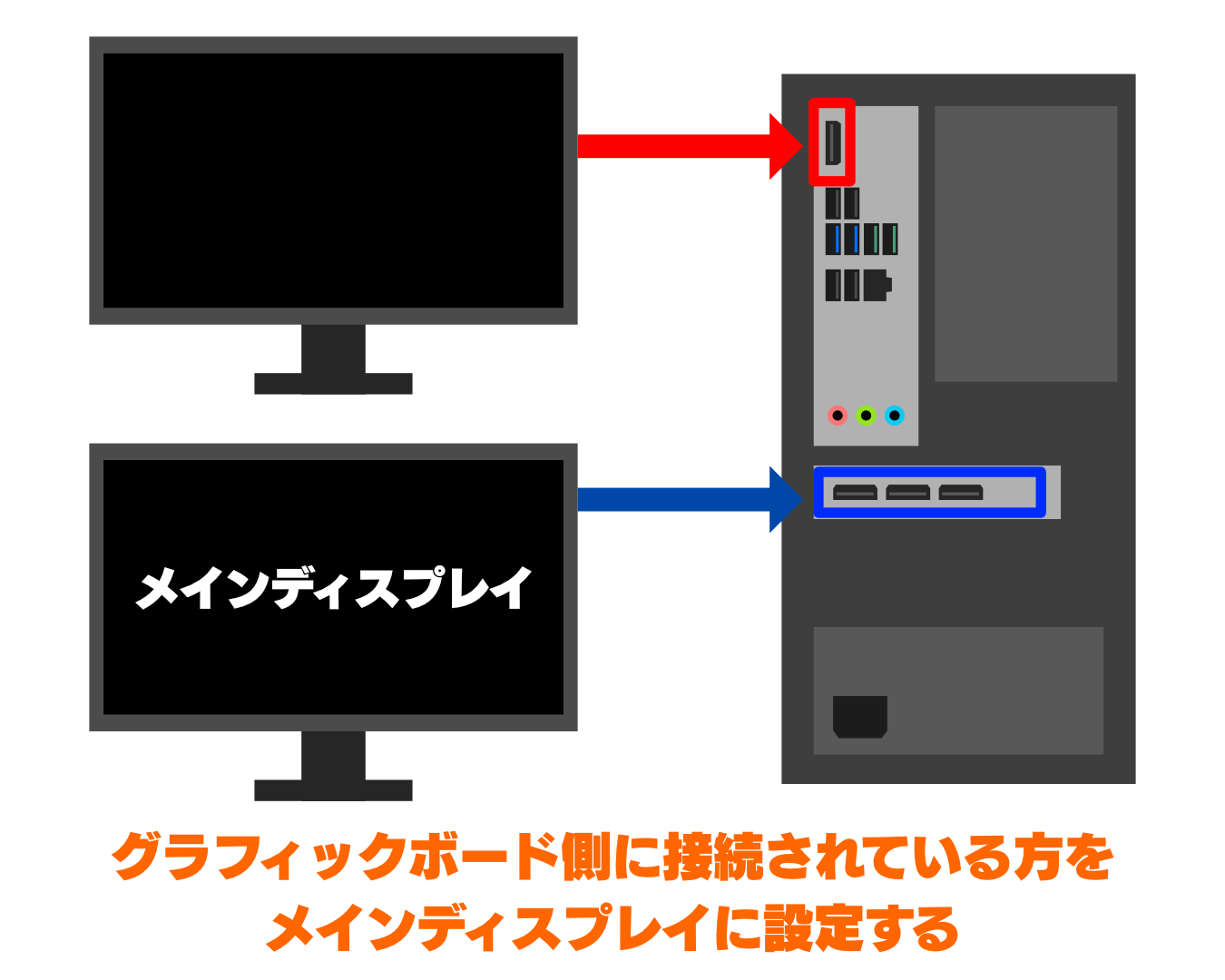 全てのディスプレイがグラフィックボードのHDMI・DisplayPortに接続されていることを確認してください。マザーボード側のHDMIに接続されているものがあれば、グラフィックボード側のHDMIに接続してください。