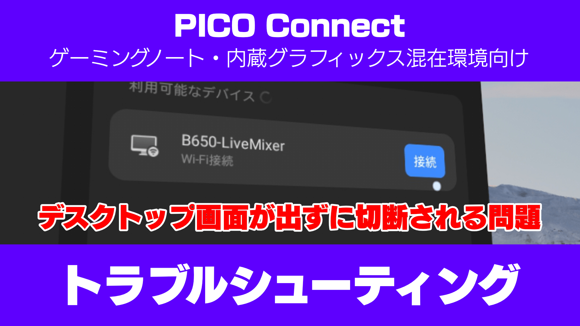 「NVIDIA GPUを搭載するゲーミングノートPC」や「CPU内蔵グラフィックスを搭載するデスクトップPC」などでPICO Connectが接続できない(デスクトップ画面が出ずに切断される)場合の対処方法です。