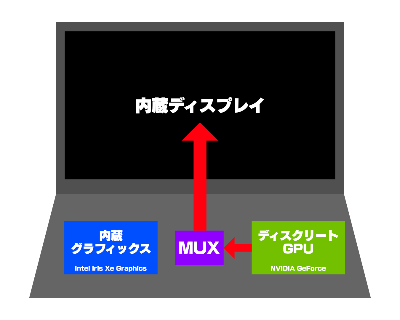 内蔵グラフィックスを「Intel Iris Xe Graphics」、ディスクリートGPUを「NVIDIA GeForce Laptop」という前提で解説をします。AMD RyzenやAMD Radeon環境の場合は読み替えてください。