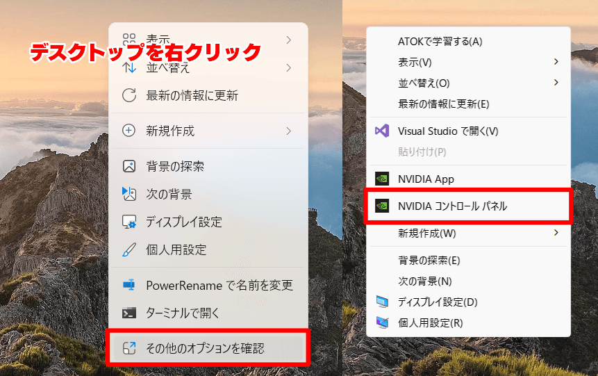 デスクトップを右クリックし、「その他のオプションを確認>NVIDIA コントロール パネル」と押してください。