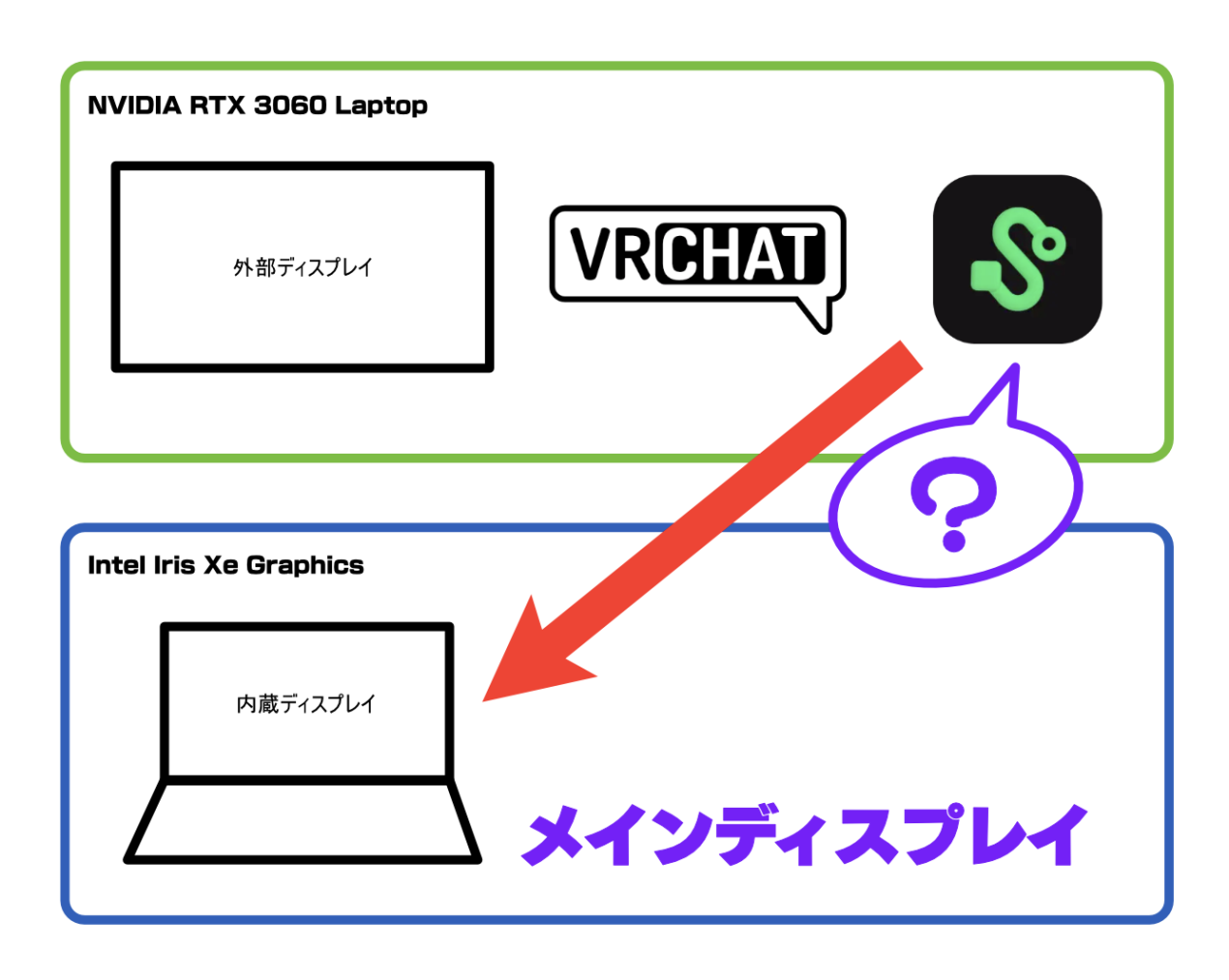 そのため、内蔵グラフィックス(Intel Iris Xe GraphicsやIntel UHD Graphicsなど)で接続されているディスプレイがメインディスプレイとなっていると、ディスクリートGPU上(NVIDIA GeForceなど)で動作するPICO Connect(ps_server)からGPUを跨いだディスプレイのキャプチャが行えず最終的に接続に失敗します。