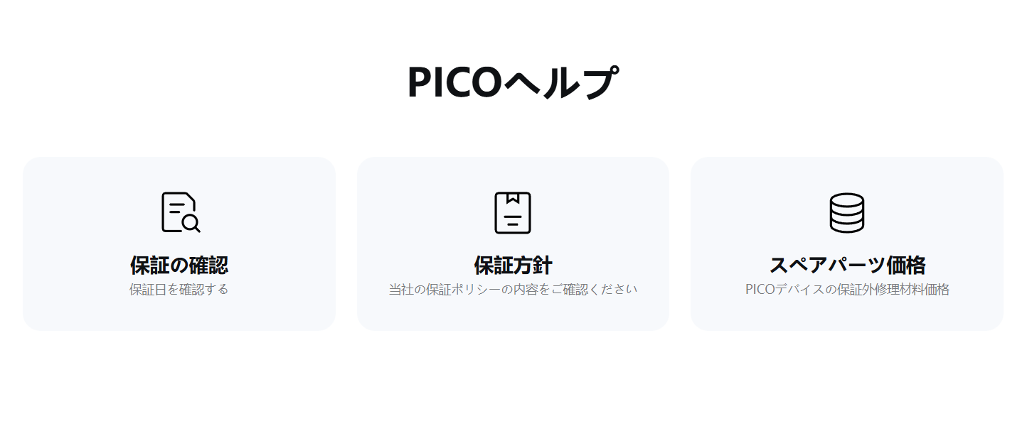 過去の話を探すと、PICOは1年間の保証期間終了後は修理を受け付けていないような話が見つかります。ウェブサイトのリニューアルが行われたこともあり、過去の保証方針については2024年8月頃までしか遡って確認できませんでした。上記の記述は2024年8月時点で存在しています。また、当時修理を断られた人がどのようなやり取りで断られたのかがよく分かっていません。