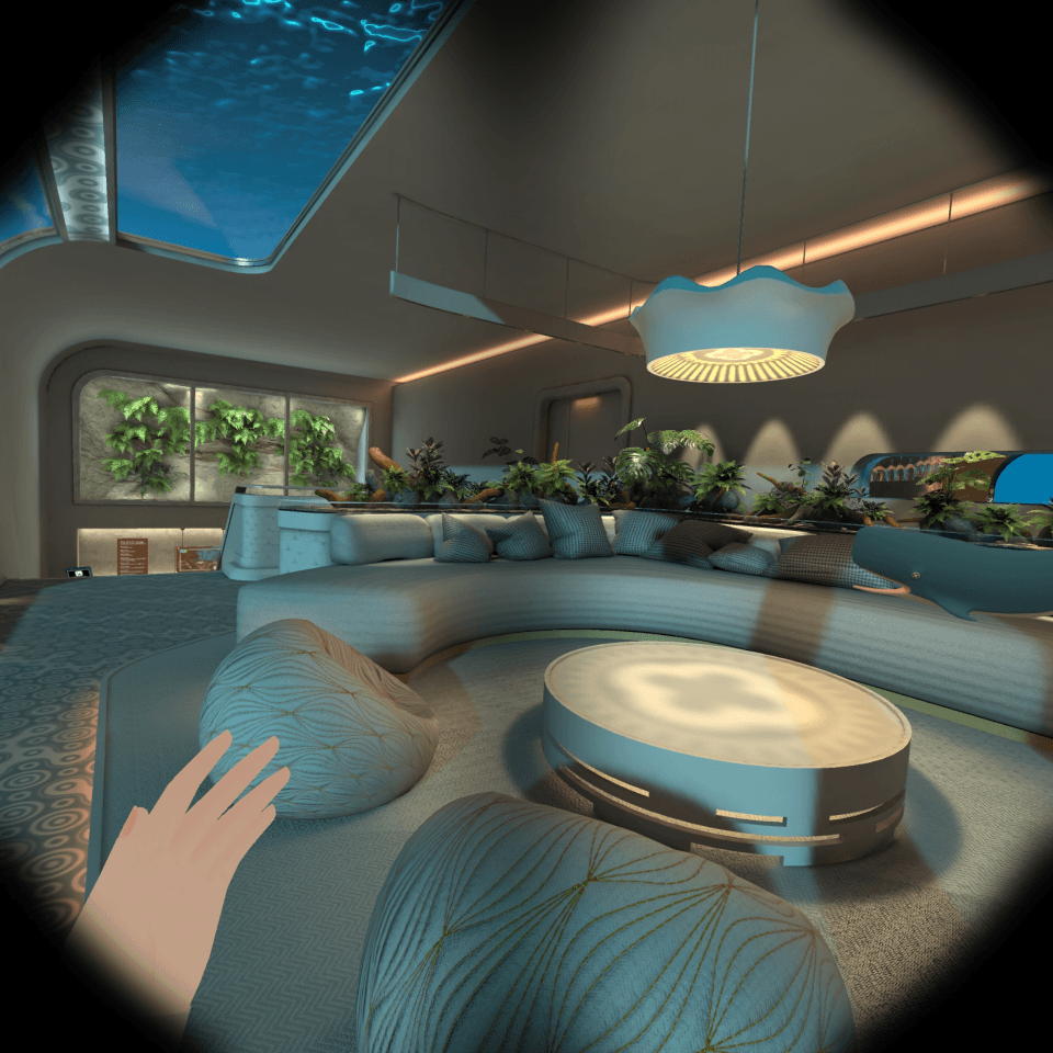 レンズ内反射で発生するゴースト(レンズグレア?)もPICO 4 Ultraでは目立ちます。この辺りはQuest 3のが若干抑えられているようです。以下の画像はPICOのホーム画面ですが、下の水色の発光している物体が視界の端に来ると、左側の図のようにふんわりと色が反射して見えます。
