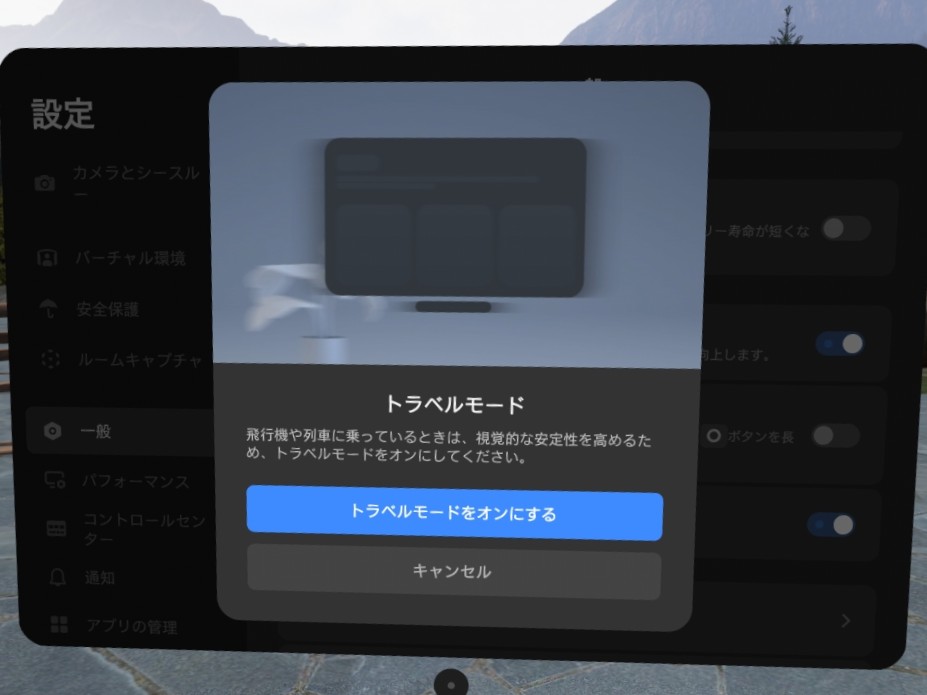 - トラベルモードに新たに対応し、高速鉄道や飛行機などの移動中でも、安定して快適なXR体験をお楽しみいただけるようになりました。設定またはコントロールセンターで有効にできます。