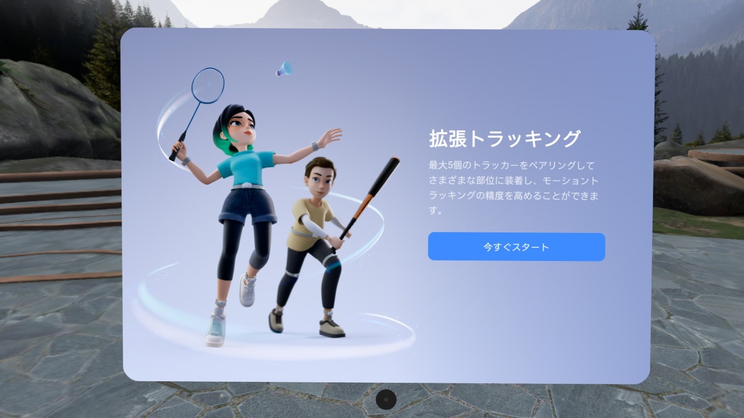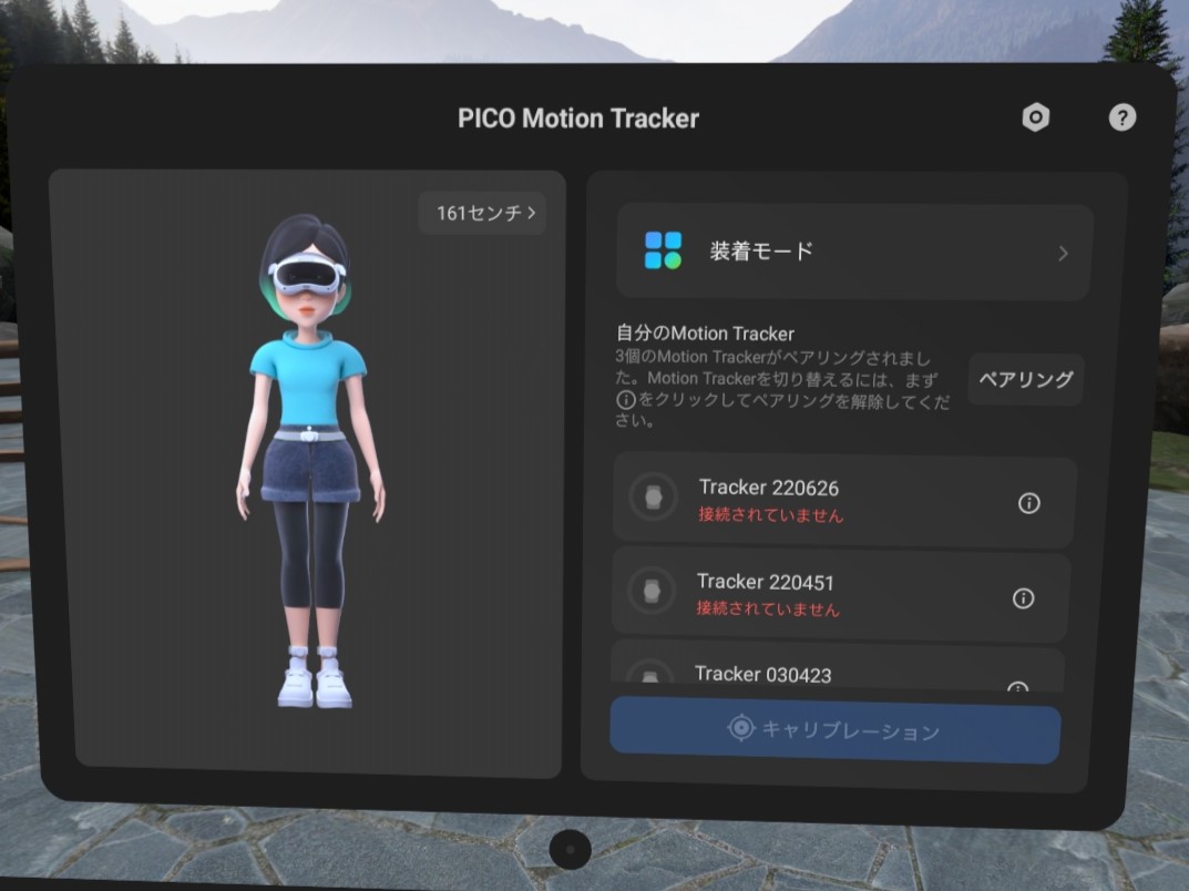 足首と膝のトラッカーが同一直線上に並ぶため、見下ろしたときに上手く認識されなかったり、認識に時間が掛かる場合があります。覗き込むように少し前のめりになって見るか、片足ずつ前に出して視界にトラッカーを映すことでもキャリブレーションは完了できます。