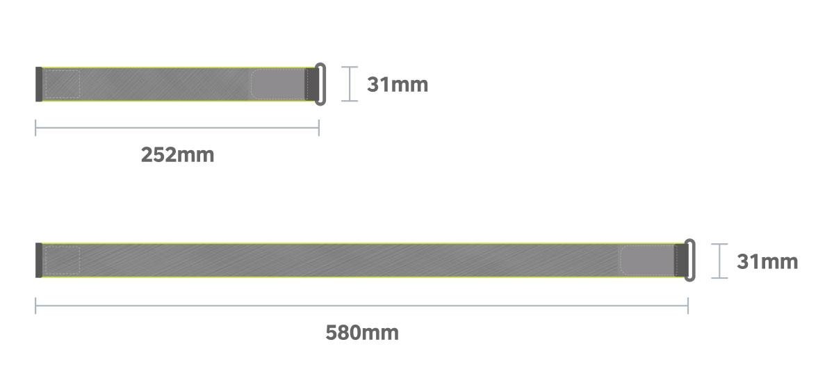 長さは手首用が252mm、膝(太もも)用が580mmとなります。