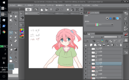 ラフや落描き用途だろうと想定して、Windows側は画面輝度25%(思いのほか明るい)、非通知モード(絵を描いてるときに通知が来ると邪魔なため)という設定にセット。イラスト制作に使用するCLIP STUDIO PAINT EXは、キャンバスをA4サイズ350dpiの設定で使用しました。