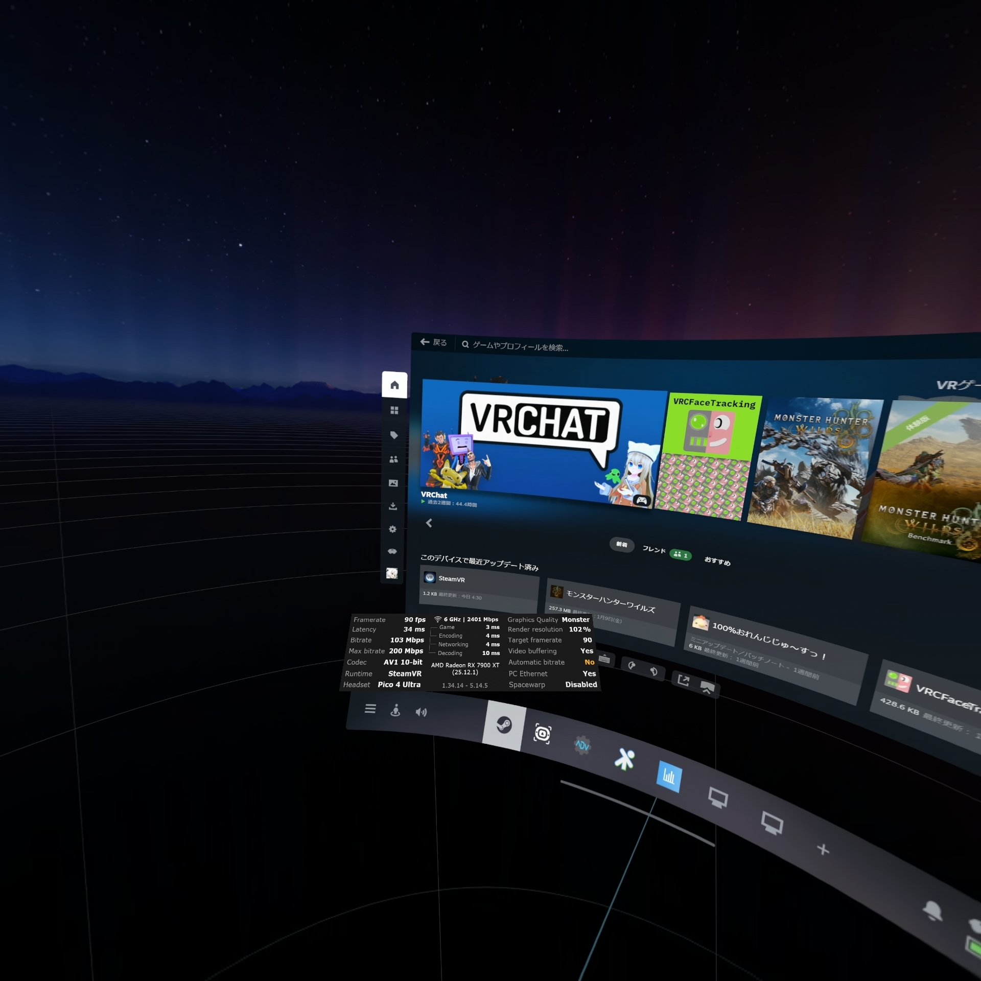 Monster解像度でH.264+の600Mbpsに設定すればとても綺麗に見えますが、かなりの性能を求められます。ひとりでVRChatのワールド巡りするぐらいならなんとかなるかもしれませんが、これで他人と交流するのは難しいです。RTX5090のパワーを持て余している方向けと言えるでしょう。