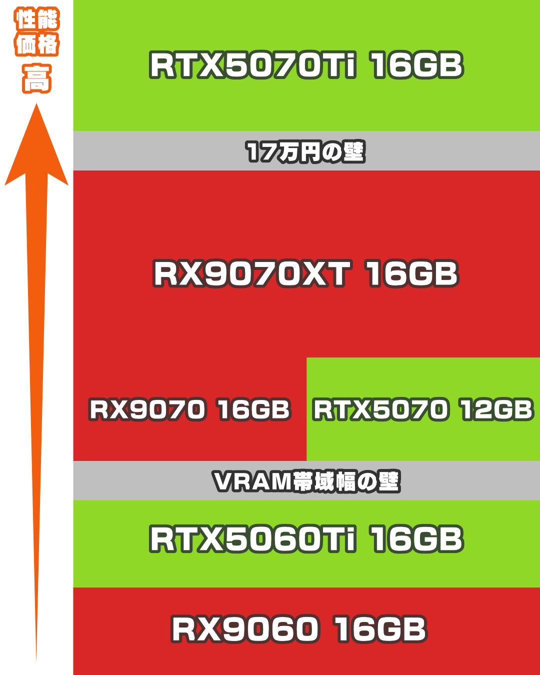 これからGPUの価格も上がるはずなので、12〜15万円付近ならRX9070XTを選び、17〜18万円出せるならRTX5070Tiという感じになるのではないかと考えています。