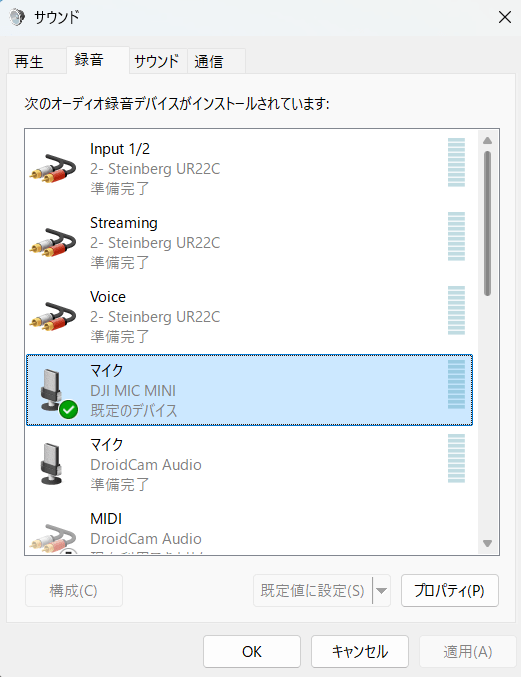 | デバイス | マイク(DJI MIC MINI) | ちゃんとDJIのマイクが選ばれているか確認しましょう。 マイクを繋ぎ直したりすると外れるため、規定のマイクにしてない限りは接続の度に設定が必要です。 |