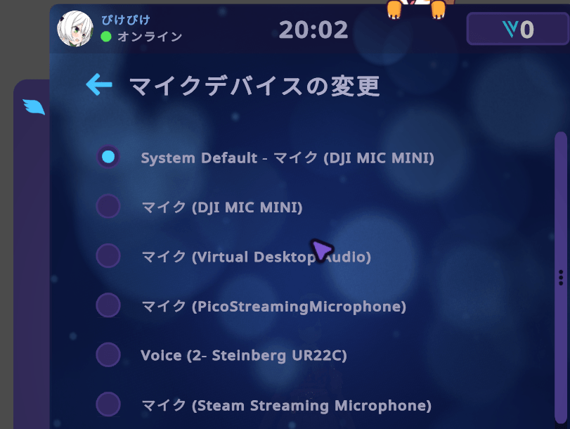例えばPICO Connectの場合は規定のデバイスを変更する機能(ストリーミング用にヘッドセットのマイクに自動切り替え)があるので、不要であればオフにしておくと良いでしょう。DJI Mic Miniしか使用しないなら、マイク自体をオフにしてしまっても構いません。