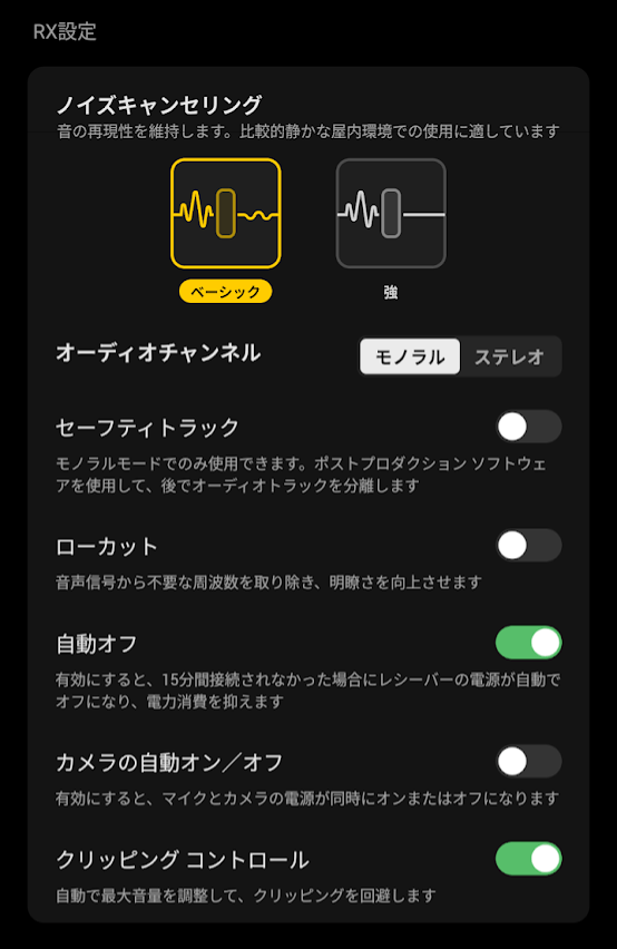 | 自動オフ | 任意 | トランスミッター(マイク)とレシーバー(受信機)の両方に設定があります。 |