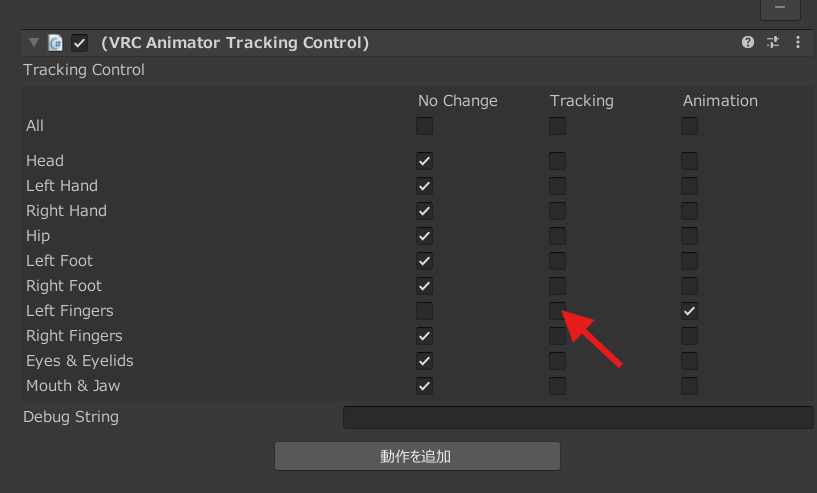 「VRC Animator Tracking Control」のLeft/Right Fingersの部分を「Tracking」に切り替えると、ハンドトラッキング時にアニメーションが動作しなくなり、指が自由に動かせます。