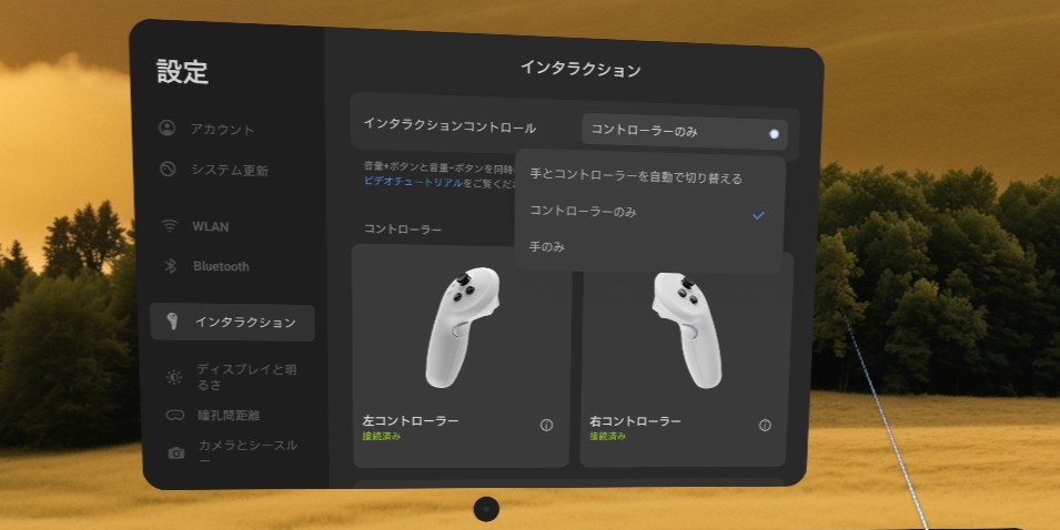 ハンドトラッキングを使う予定がない方は、「コントローラーのみ」にしておくことをおすすめします。自動切り替えが有効だと、少し静止したときにすぐ切り替わってしまいます。