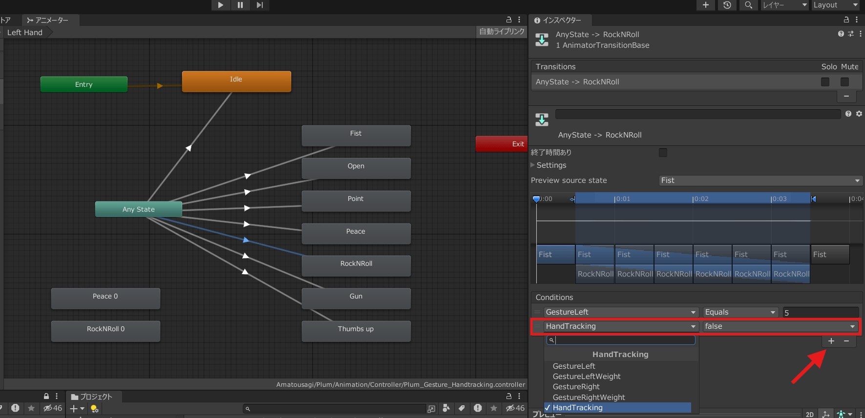 次にConditionsの+ボタンを押して「GestureLeft」と「HandTracking」を追加します。
