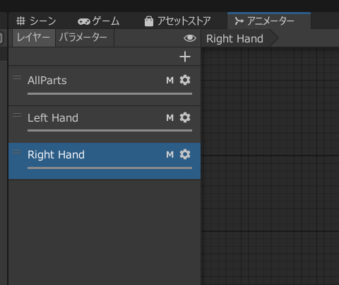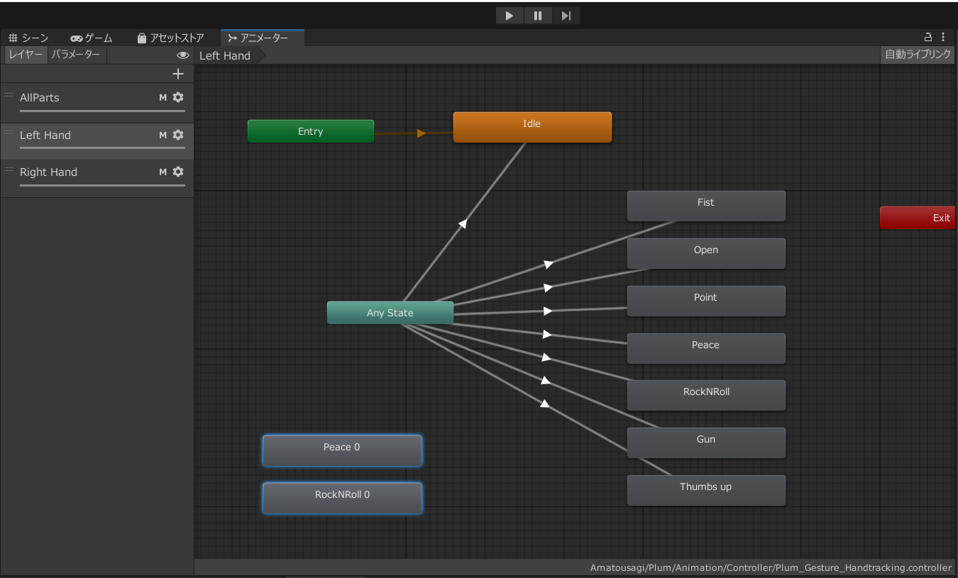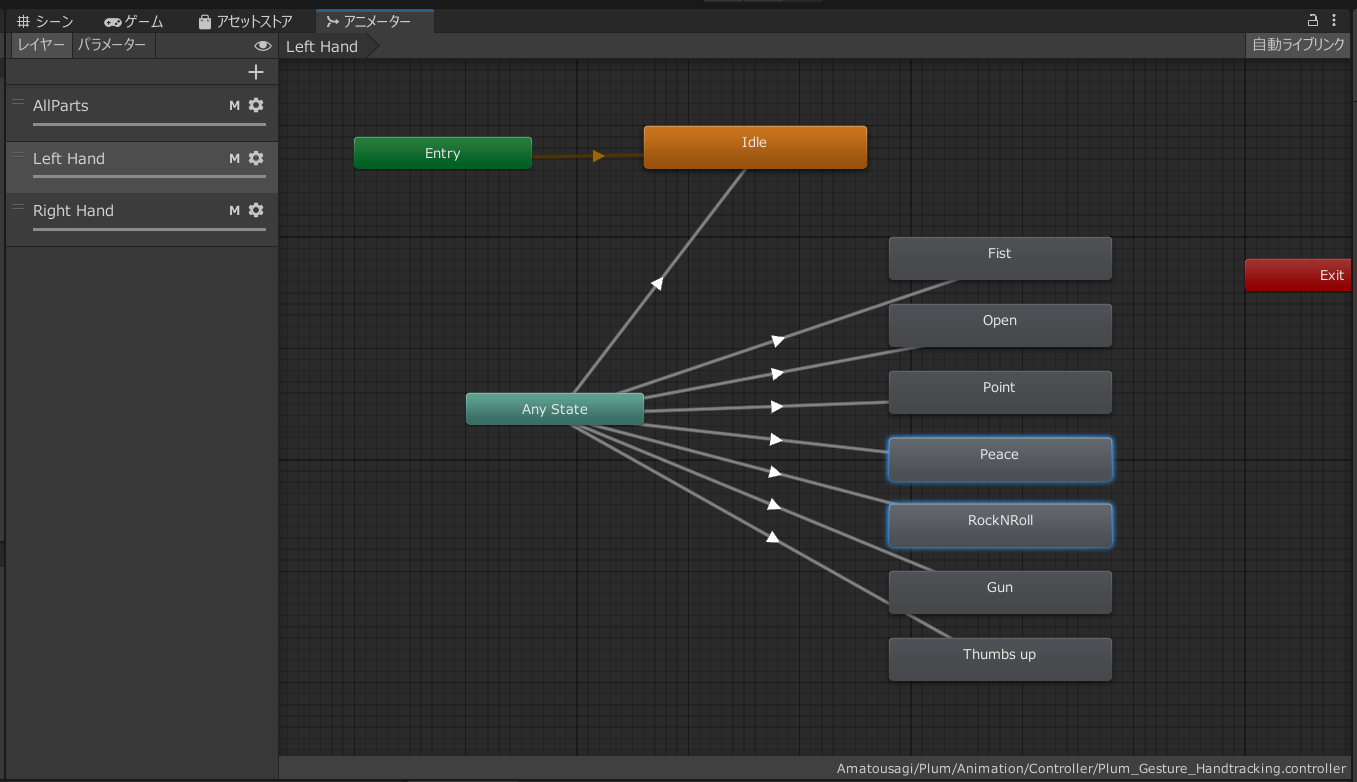 アニメーションコントローラーをアニメータータブで開くと、Left HandレイヤーとRight Handレイヤーの両方にハンドサインが設定されています。