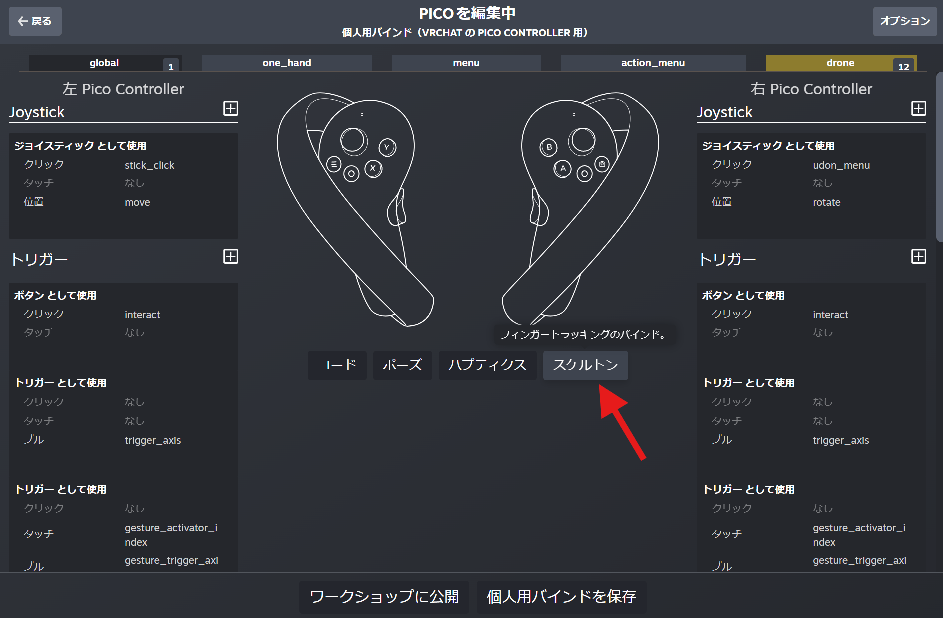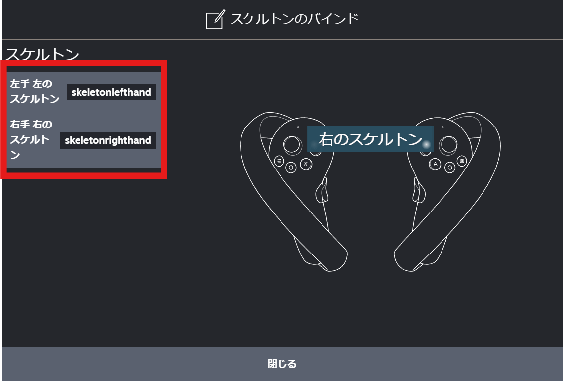 ハンドトラッキングで両手の指が動かない場合や、過去にコントローラーのバインド設定を変更した方はスケルトン設定を元に戻す必要があります。