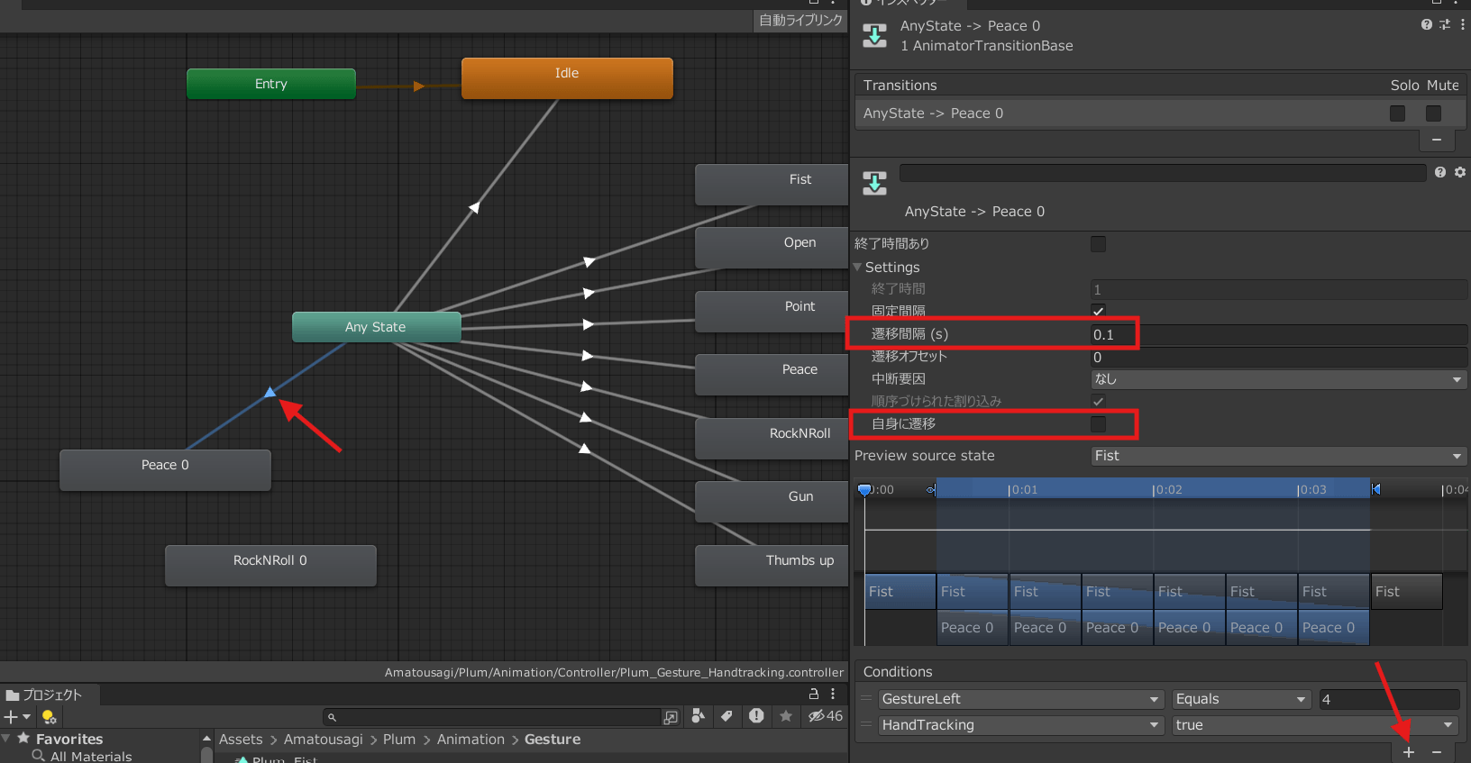 繋がった矢印を選択して、Any StateからPeace 0へ遷移するための条件を追加します。