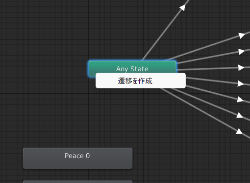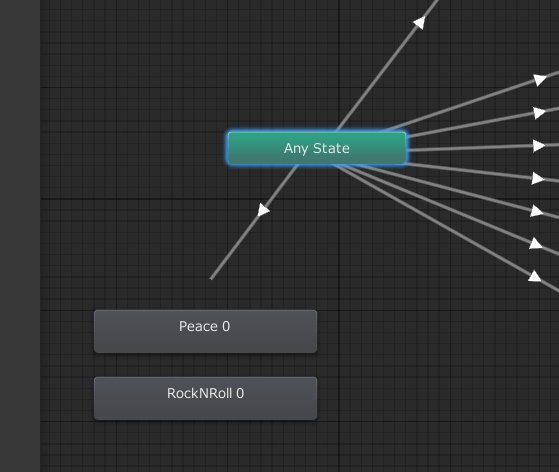 既存アニメーションの分岐条件を確認します。Any StateからPeaceやRockNRollに向かって延びている白い矢印をクリックしてください。