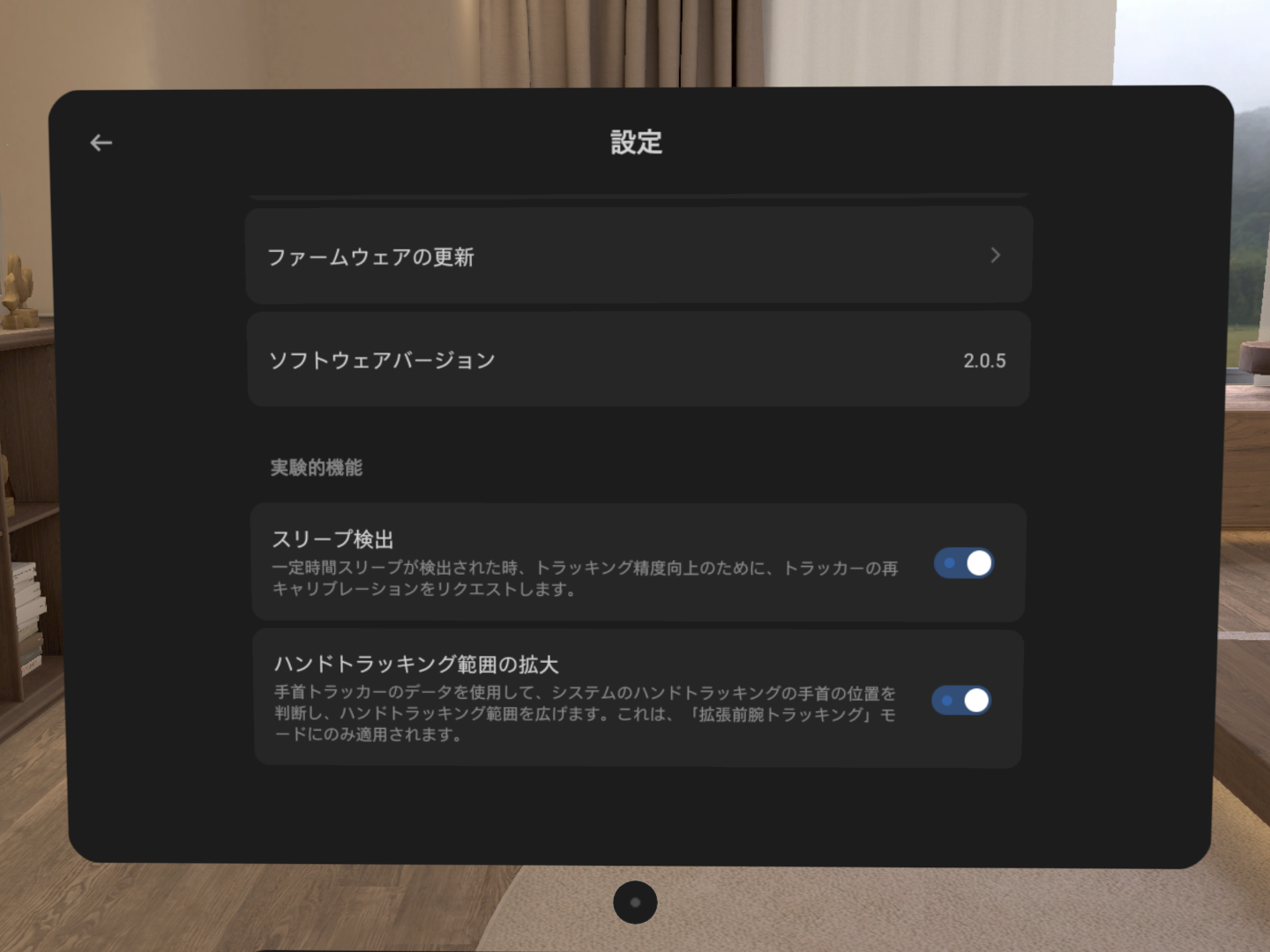 「ハンドトラッキング範囲の拡大」を使用すると、ハンドトラッキングのまま手を後ろに回す動きができるようになります。但し、カメラの範囲外では手の形をトラッキングできないのと、手の位置がおかしくなったり指が震えて上手く操作できない場合があります。