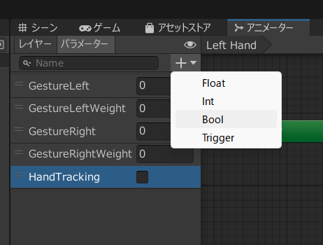 複製したGestureレイヤーをクリックしてからアニメータータブで開き、レイヤータブからパラメータータブに切り替えます。+ボタンからBoolを選んで、名前を「HandTracking」に設定します。(自由な名前をつけてOKです)