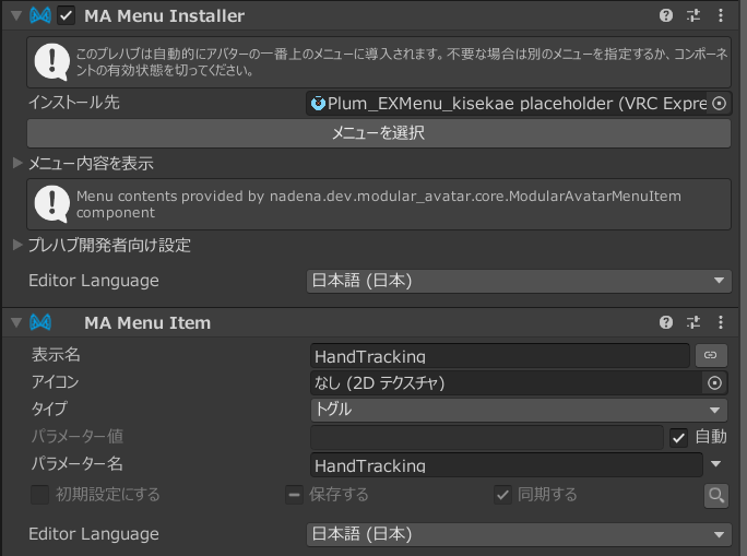 「MA Menu Installer」には自動的にインストール先が設定されるので、そのままで構いません。「MA Menu Item」の表示名を適当な名前に設定して、タイプを「トグル」パラメーター名を「HandTracking」にしておいてください。
