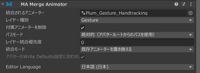「MA Merge Animator」には一番最初に複製しておいた「Gestureレイヤー」を統合されるアニメーターに設定します。レイヤー種別は「Gesture」にしましょう。