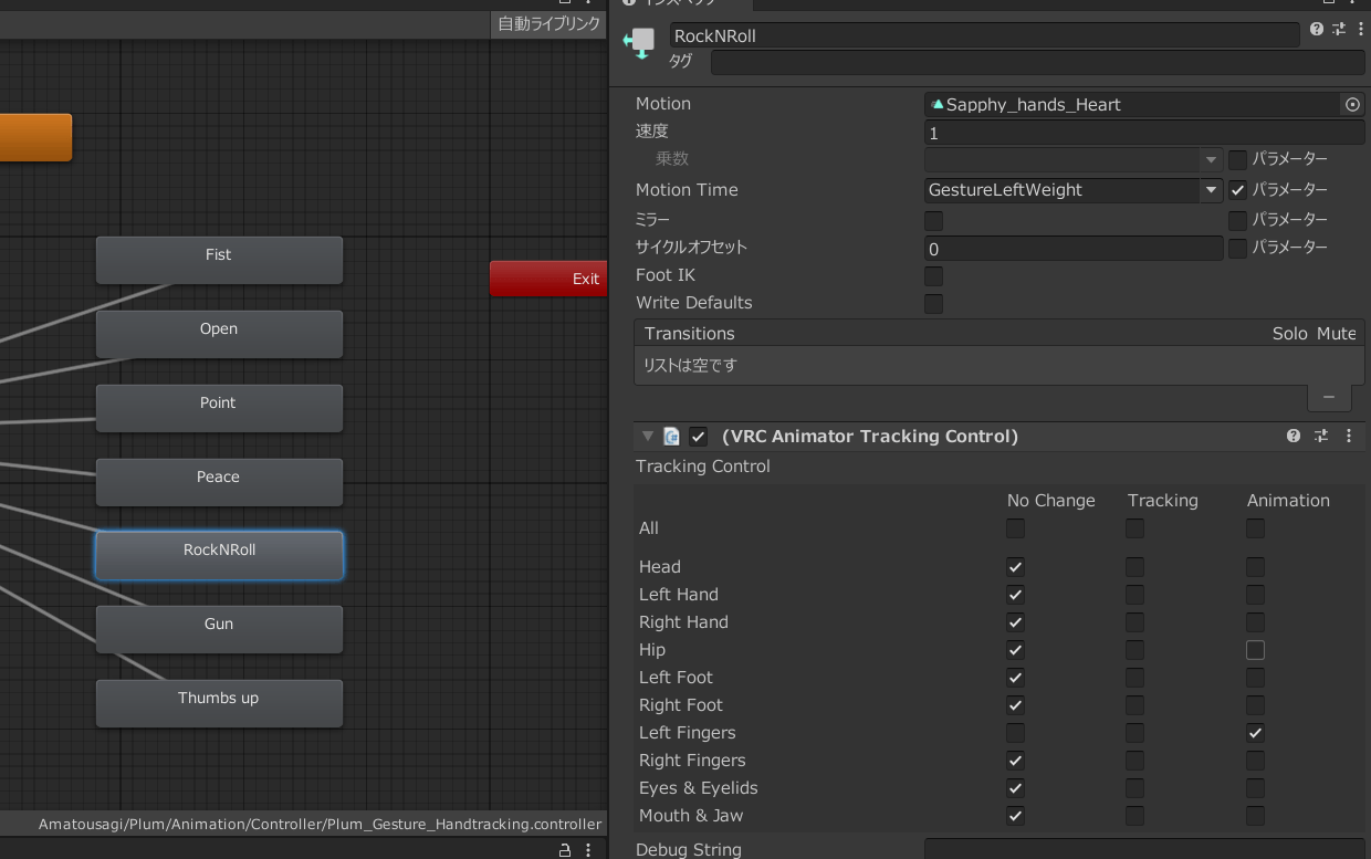 「Peace 0」や「RockNRoll 0」を選択して、「VRC Animator Tracking Control」の「Left Fingers」を「Tracking」に変更します。