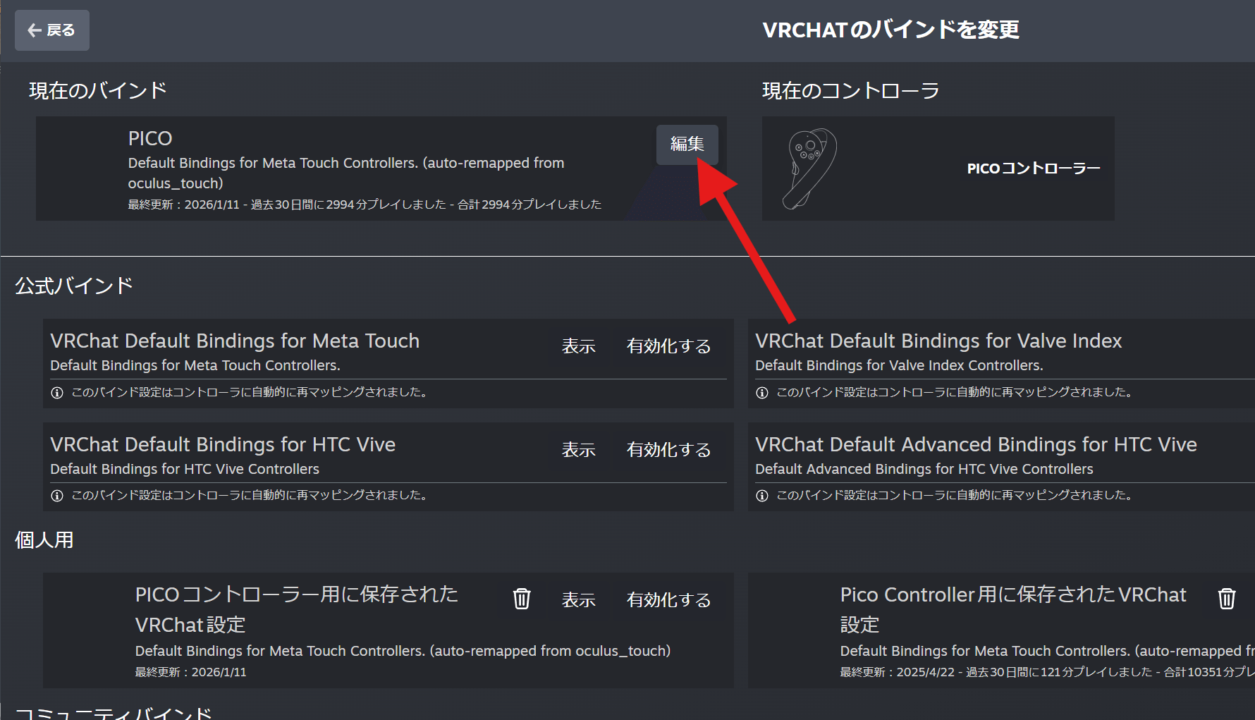 Meta Touchのバインドになっていることを確認してください。HTC ViveやValve Indexになっている場合は変更してください。次に現在のバインドの「編集」を押します。