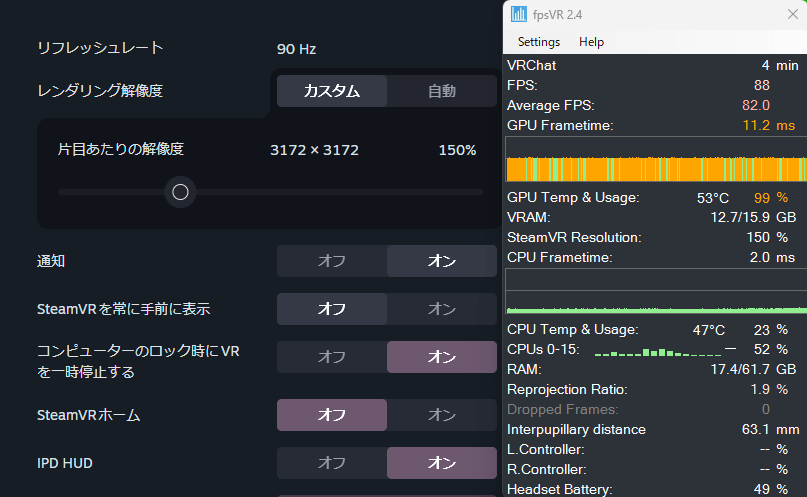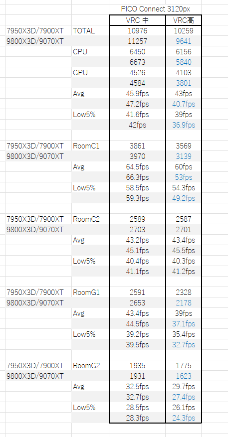 VRCMark v2でベンチマークを取った際に、片目3120x3120pxの状態でVRChatのグラフィック設定を中から高に変更するとスコアが逆転したのと大体一致します。