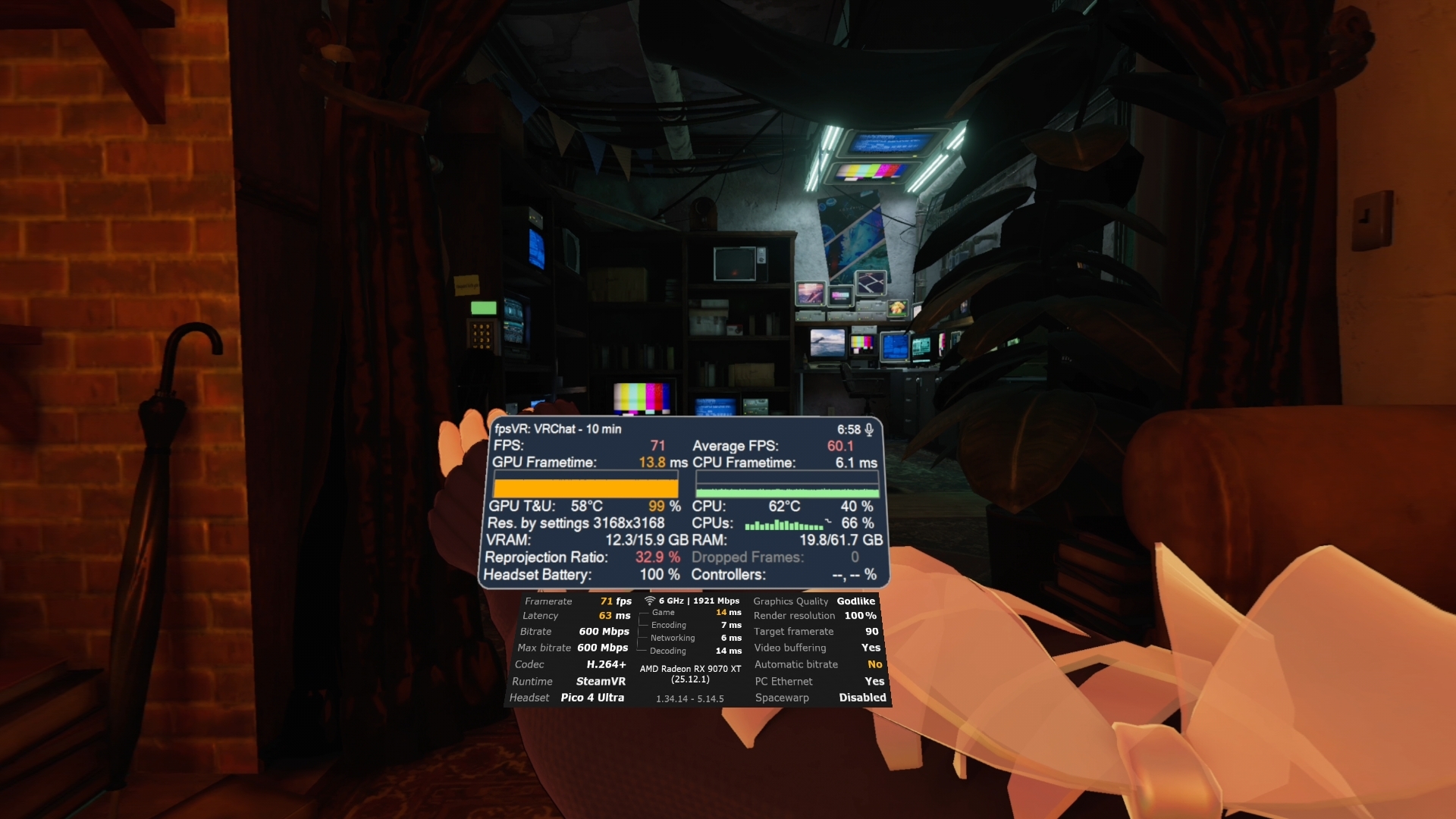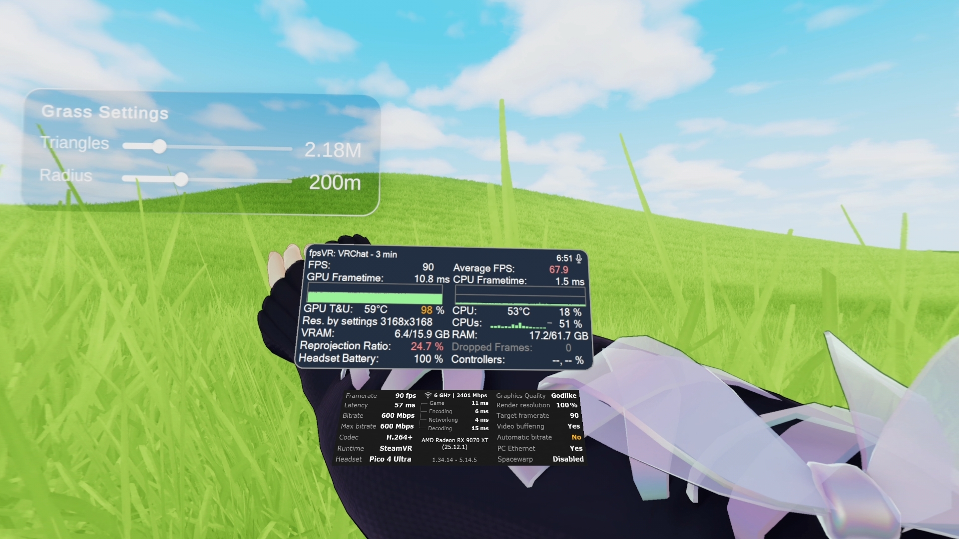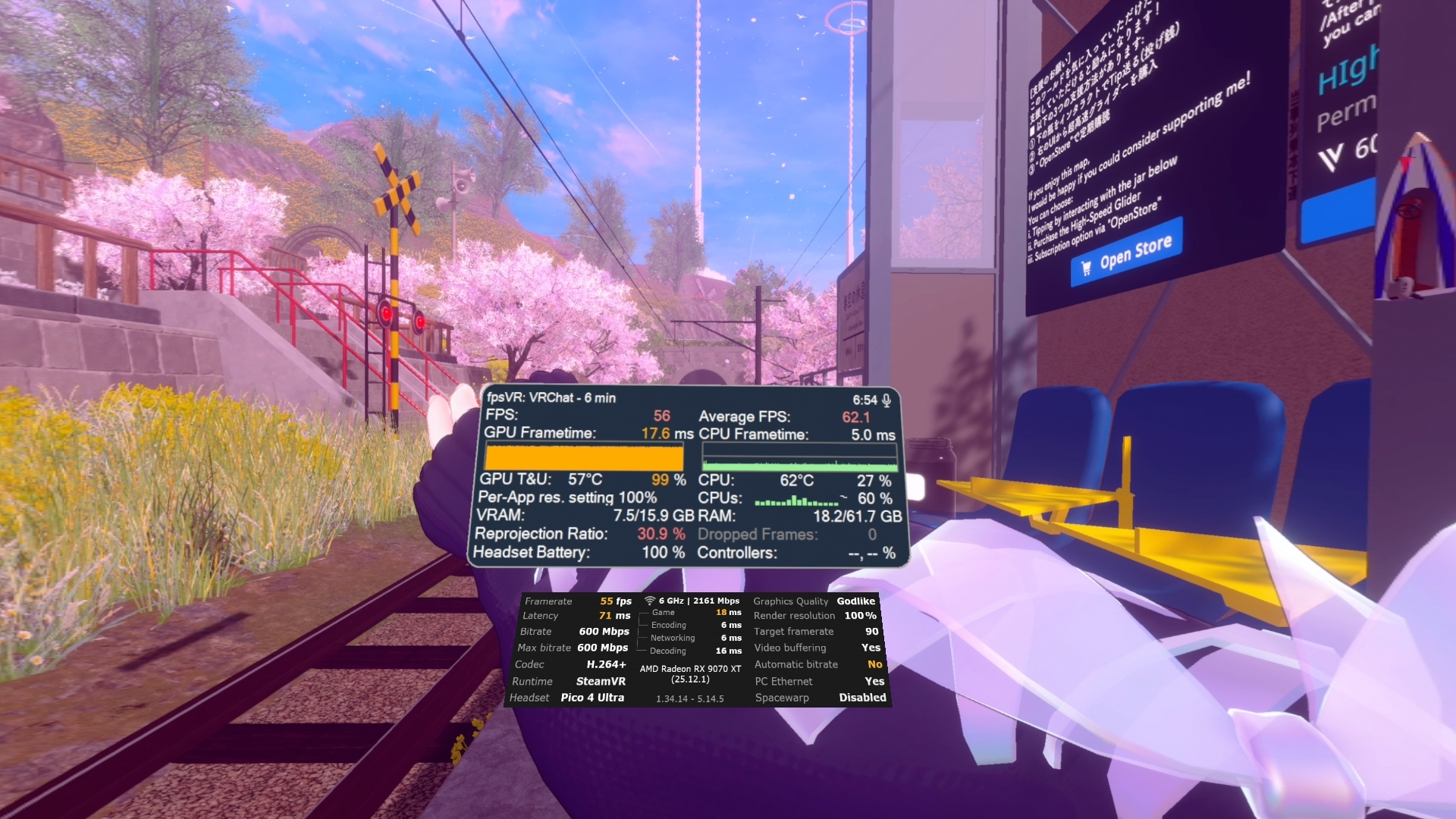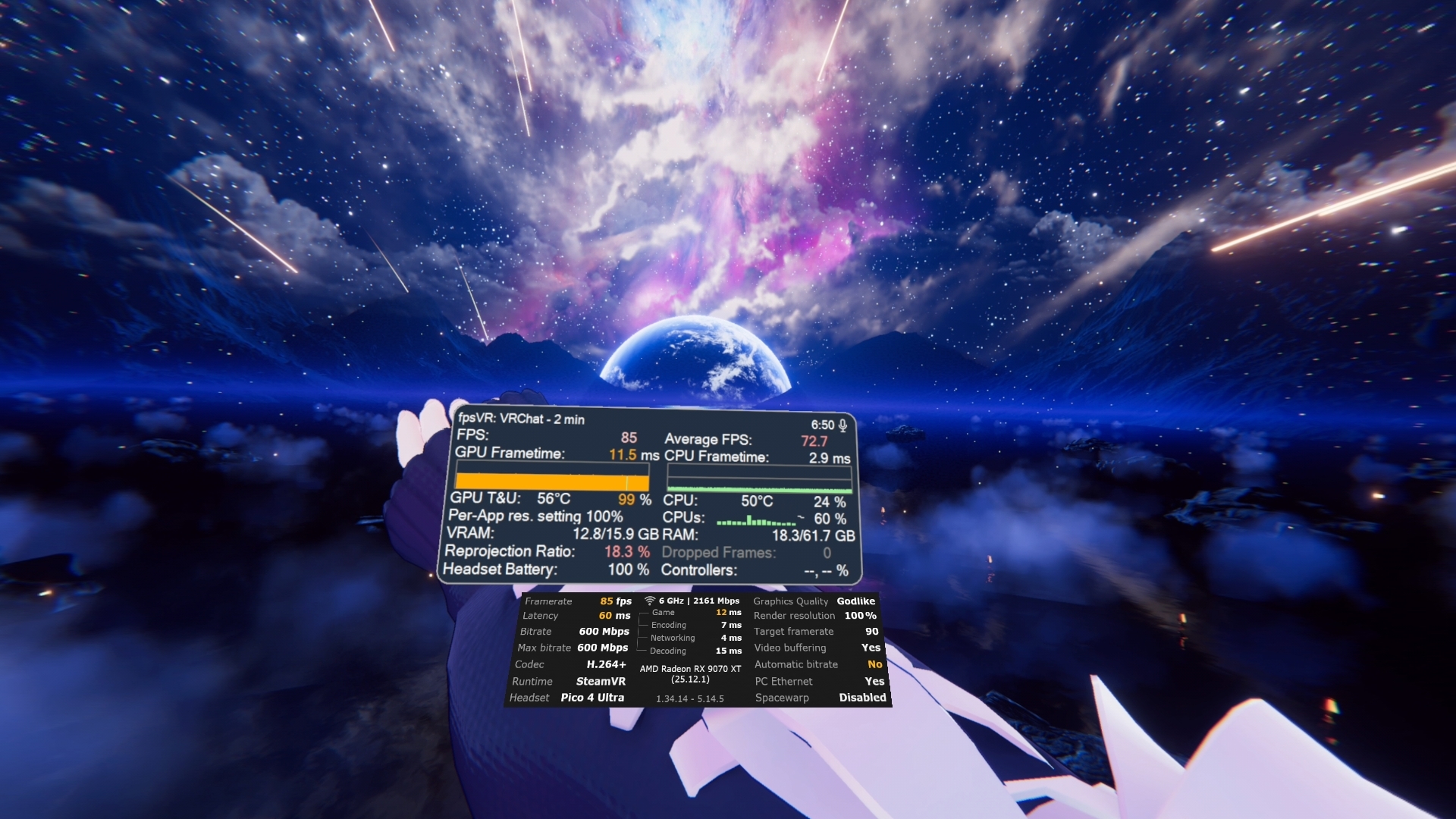 PICO 4 UltraとVirtual Desktopを使用し、H.264+ 600Mbpsの設定でテストしています。VRChatの設定はアンチエイリアス設定以外を全て最高設定にしてあります。(高プリセットベースでミラーを無制限に)