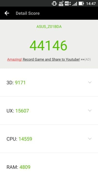 ZenFone 3 Laserの総合スコアは44146でした。内訳は3Dが9171、UXが15607、CPUが14559、RAMが4809です。比較対象としたSnapdragon 617搭載のHTC One A9はUX I/Oパフォーマンスの測定エラーが発生して正確な総合スコアが出せませんが、それを考慮して計算するとほぼ同スコア。RAMのスコアは少し劣りましたが、大きな違いと言えば3DのスコアがZenFoneのが少しだけ高めだったことでしょうか。